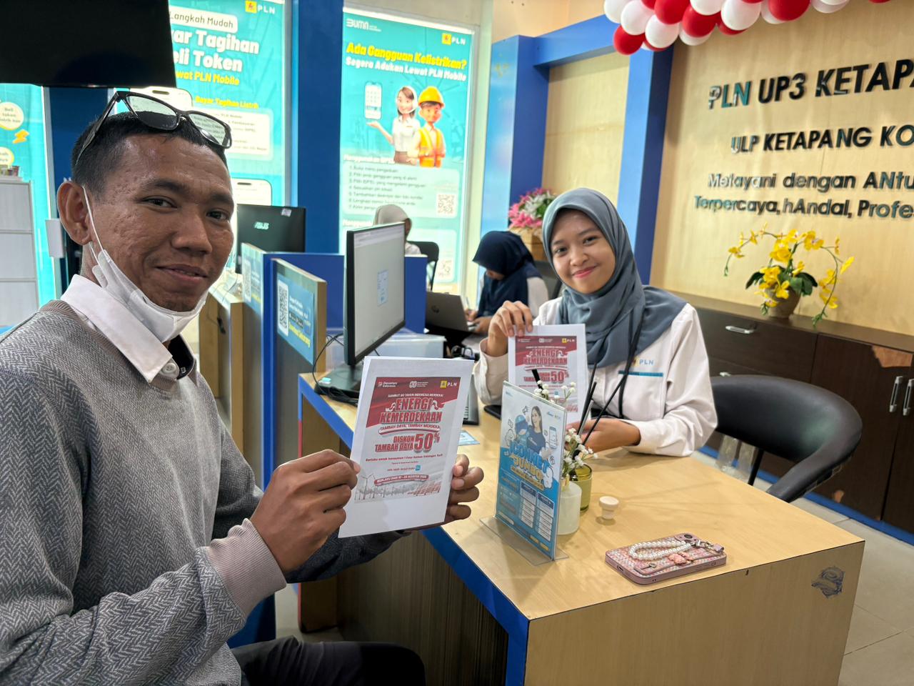 | Terlihat senyum pelanggan setelah menerima penjelasan dari petugas PLN mengenai kemudahan proses promo “Energi Kemerdekaan” yang cukup diakses melalui aplikasi PLN Mobile.(FOTO/DOK/PLN) |